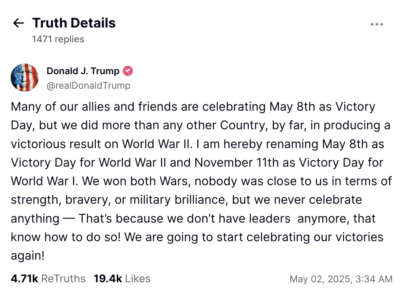 The former president took to Truth Social late Thursday to announce his plan, writing: “I am hereby renaming May 8th as Victory Day for World War II and November 11th as Victory Day for World War I.”