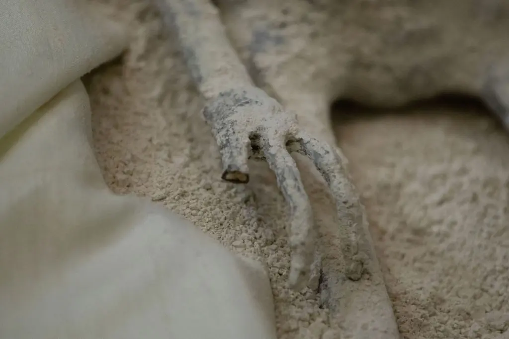 Maria's body is covered in diatomaceous earth, a white powder made from the sediment of fossilized algae.
