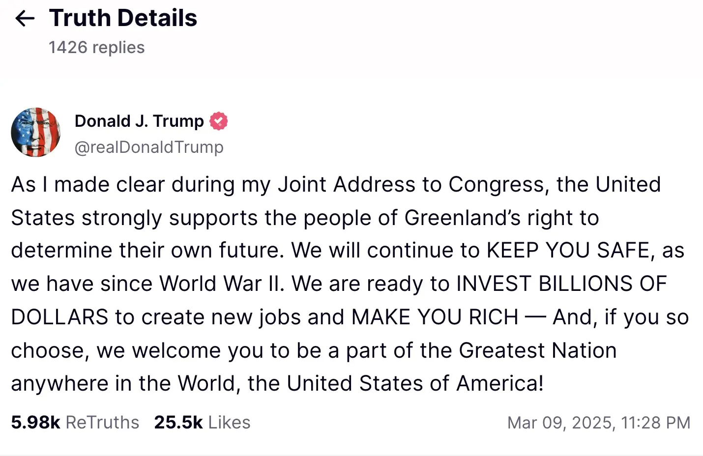 "As I made clear during my Joint Address to Congress, the United States strongly supports the people of Greenland’s right to determine their own future," Trump wrote. "We will continue to KEEP YOU SAFE, as we have since World War II.