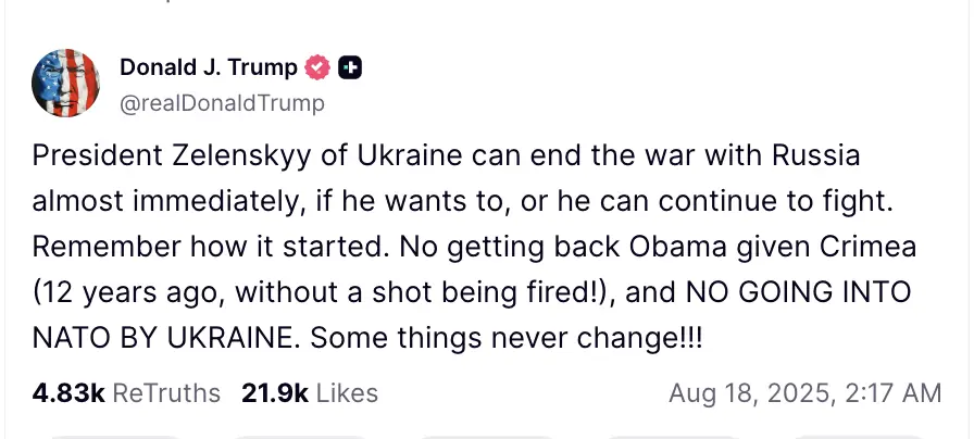 "President Zelenskyy of Ukraine can end the war with Russia almost immediately, if he wants to, or he can continue to fight," he wrote. "Remember how it started. No getting back Obama given Crimea (12 years ago, without a shot being fired!), and NO GOING INTO NATO BY UKRAINE. Some things never change!!!"