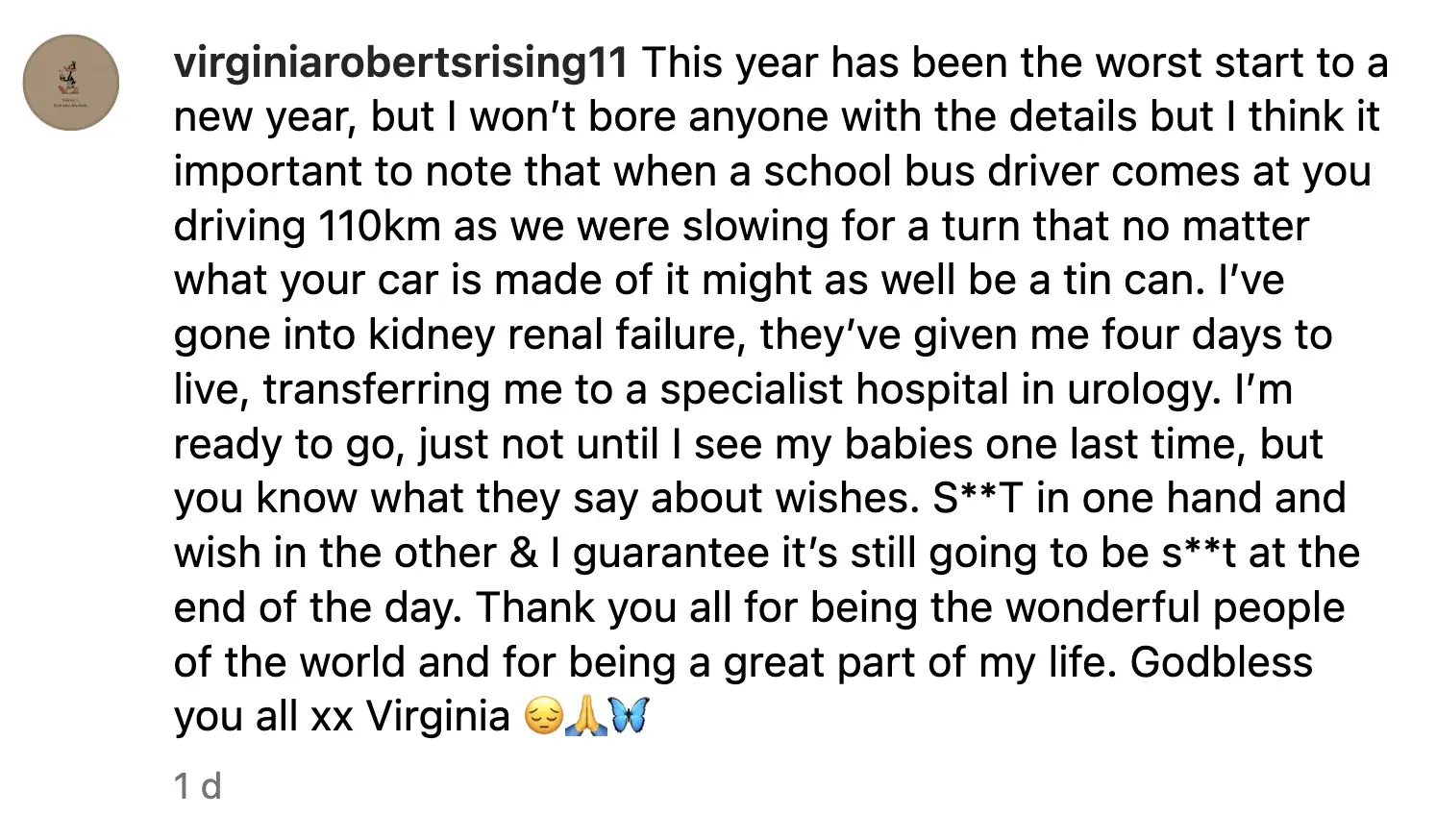 Virginia Giuffre - the American woman who became one of the most prominent accusers of sex trafficker Jeffrey Epstein and Prince Andrew - has said she’s been given just days to live following a serious car accident in Australia.