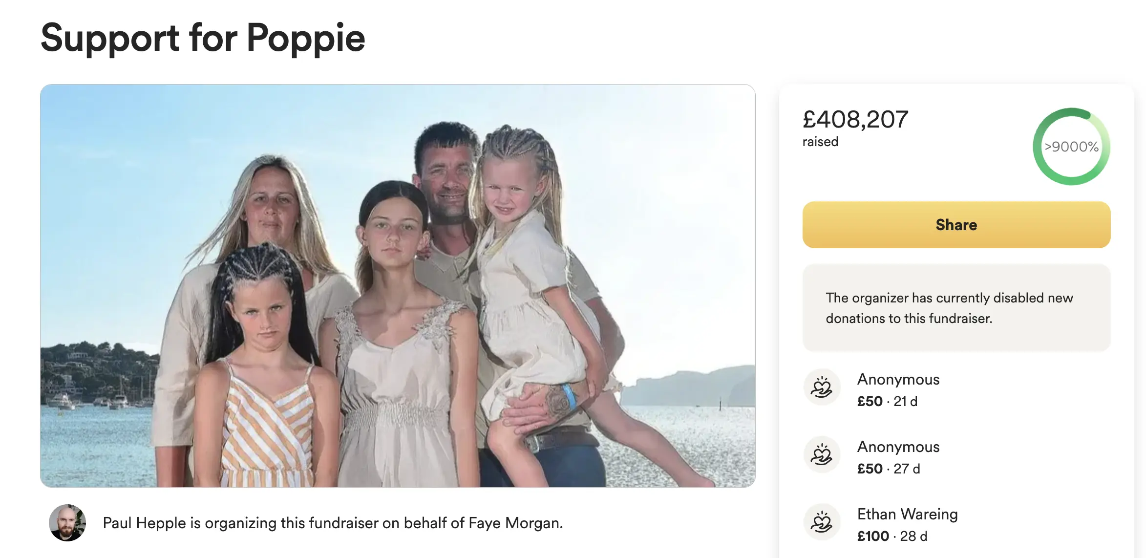 "Any contribution, no matter how small, will make a significant difference in Poppie's life. Your generosity will help her navigate this difficult time and build a brighter future," the description read.