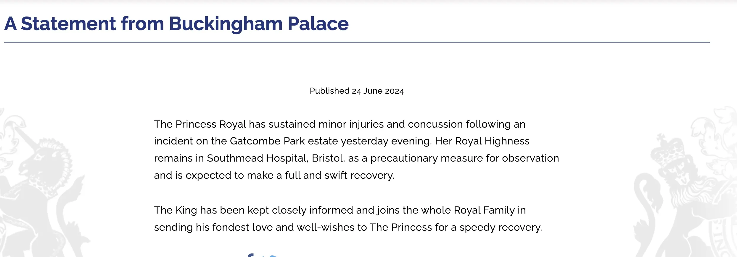 "Her Royal Highness remains in Southmead Hospital, Bristol, as a precautionary measure for observation and is expected to make a full and swift recovery."