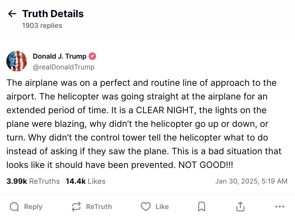 President Donald Trump said early Thursday morning that the midair collision was a “bad situation that looks like it should have been prevented".