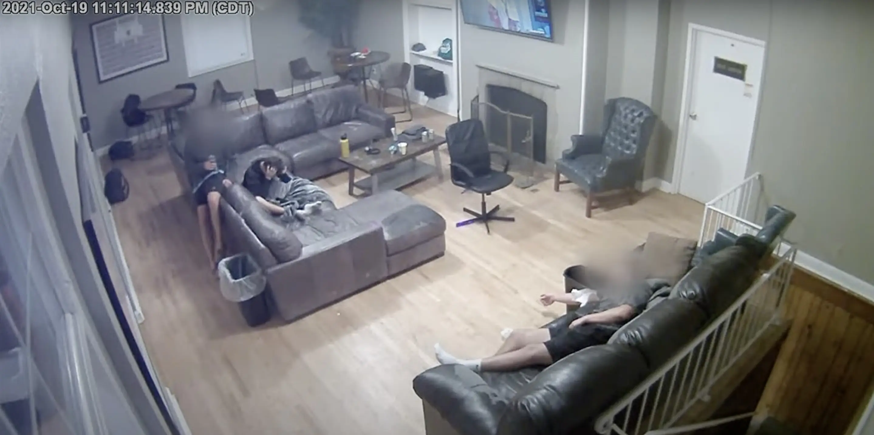 His limp body fell head-first off the sofa at 12:30AM, and wasn't lifted up until 15 minutes later, when other frat members appeared to check for a pulse before he was taken outside.