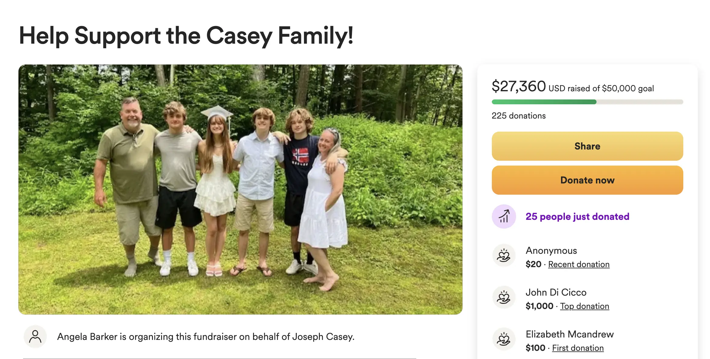 "Please consider donating to this GoFundMe to help cover expenses for Joe and his family. We are targeting $50,000 as a goal so whether you can donate $5, $25, $50 or more, every little bit helps considerably," they continued, adding: "The Casey Family, Joe, Kim, Jake, Lily, Max and Ben thank you in advance for your generosity."