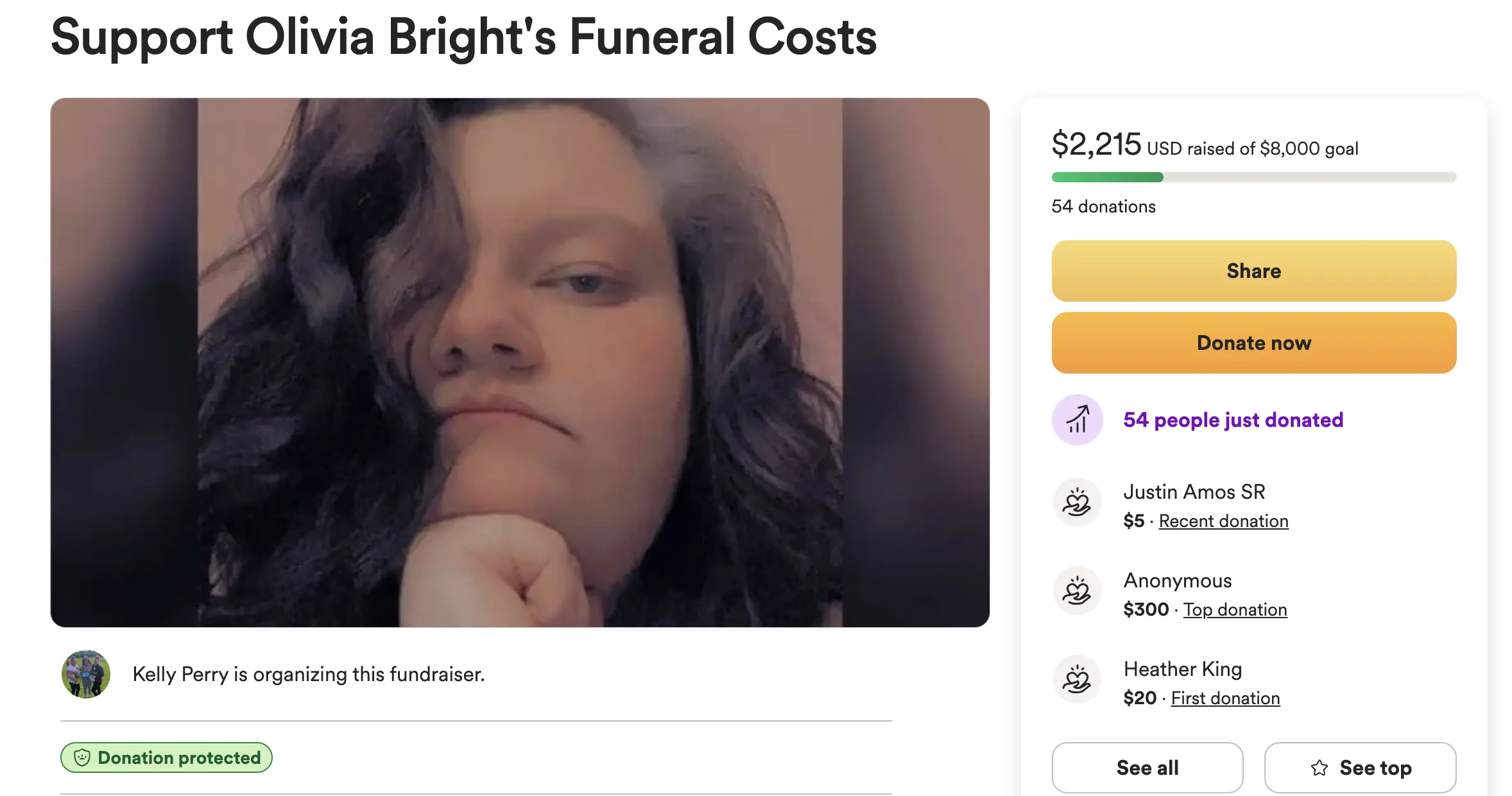 "It's hard," Kimberly said of her daughter and son's passing. "Five-and-a-half years ago, I buried my son Brandon. He was the age 11. He died of glioblastoma. Now I have to go and make arrangements for my daughter Olivia."