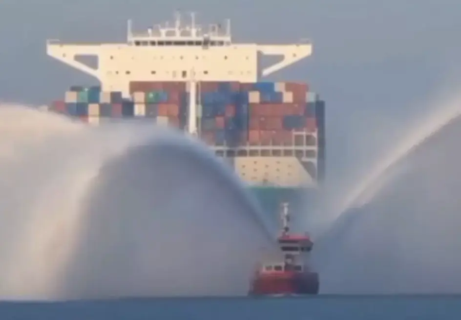 The now widely shared clip, viewed over 50 million times across X and YouTube, shows a tugboat escorting a towering cargo ship while shooting water high into the sky.